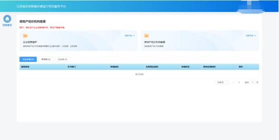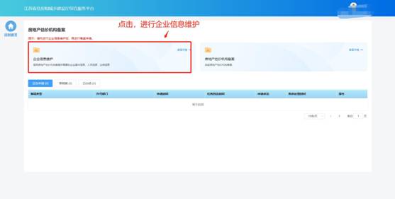 点击首页“企业管理”模块中“房地产估价机构备案”图标可进入房地产估价机构备案功能模块页进行相关业务维护和办理。