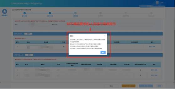 事项申请需要的人员选择完成后,点击“下一步”按钮,系统会按照申报要求对选择人员进行初步校验,对于不满足要求的人员进行错误提示。若选择人员满足要求则进入下一个环节。