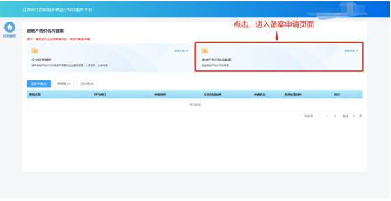 在完成企业信息维护后,点击房地产估价机构备案功能模块页中“房地产估价机构备案”进入备案申请页面。