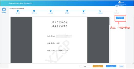 在“申请表预览”页面展示系统根据企业填报的内容自动生成的申请表,点击“下载申请表”按钮下载申请表Pdf文件,企业将申请表打印后进行盖章,然后点击“下一步”按钮上传盖章扫描件。