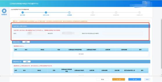 在“人员情况”环节页面,企业按照所申请资质级别要求选择对应的各类人员。选择的人员信息为企业在“企业信息维护”页面已经维护的对应角色的人员,如有信息不正确或者信息缺失,需返回“企业信息维护”页面进行修改或补充后,再继续进行申请。