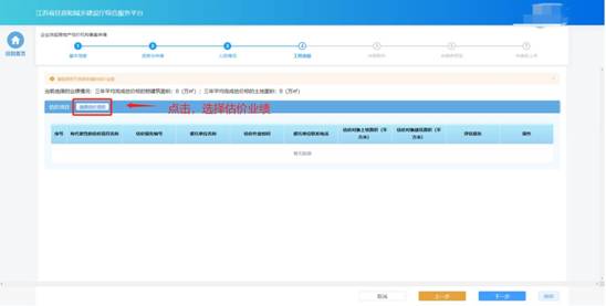 若申请的资质对于业绩有要求,则申报流程会包含“业绩”环节。在“业绩”环节页面选择用于本次申请的估价业绩,选择完成后点击“下一步”进入下一个环节。