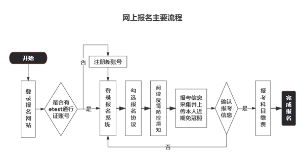 4.网上报名需要ETEST通行证账号,该账号在教育部考试中心所有使用ETEST通行证的报名系统中通用。若考生已有ETEST通行证,则直接登录报名;若没有该账号,需要先进行账号注册后再进行报名。