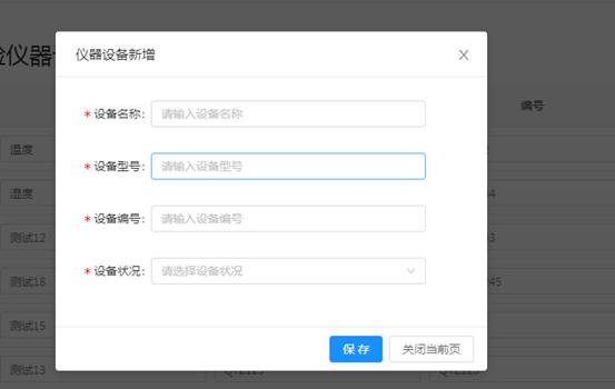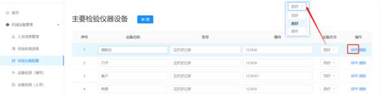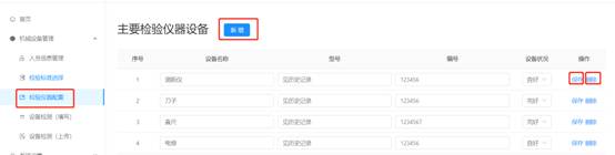 1.在仪器列表中,选择某单项设备名称,点击输入框可编辑修改设备名称、型号、编号,点击操作栏中保存即为修改成功。如下图所示。