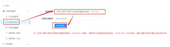 3.2检测标准配置检测流程开始前,检验检测机构在系统中选择检验标准。点击下拉框选择使用的标准,填写检测机构的计量认证编号,点击【保存并修改】完成配置。