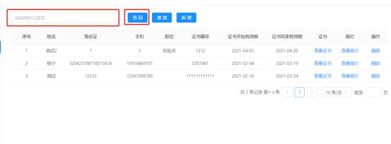 输入姓名点击【查询】,点击【查看证书】可查看人员证书信息。点击【重置】可清空输入框内容。