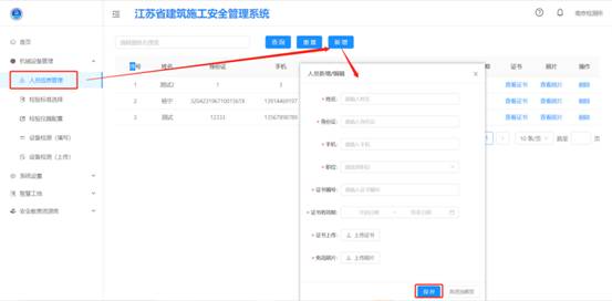 点击【新增】按钮,进入新增页面,填写检验检测人员信息,填写完成后点击【保存】。