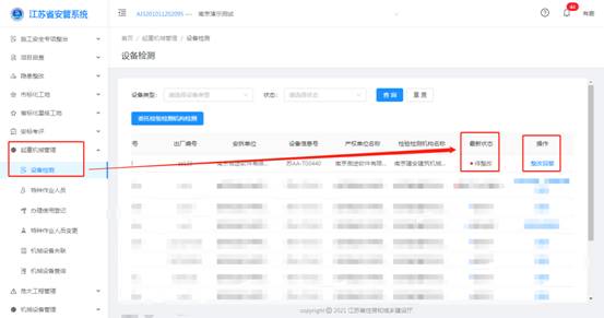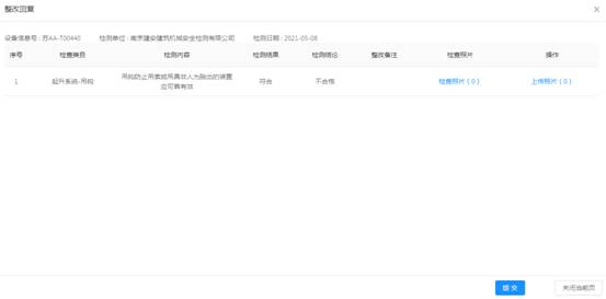 点击菜单栏的起重机械管理—>设备检测,需整改的检测机械设备显示在列表中的第一条,最新状态栏显示待整改状态及操作栏出现【整改回复】按钮,点击查看【整改回复】按钮可查看需整改的具体不合格项。