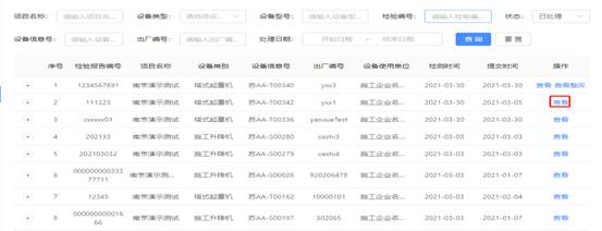 检验检测机构页面下机械设备存在【已处理】、【未处理】、【整改中】三种状态。【已处理】表示设备已完成检测流程,【未处理】表示设备尚未开始检测流程,【整改中】表示设备已开始检测流程,因存在需整改的不合格项,处于整改过程中。