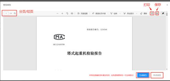 点击【预览报告】,如检测结果合格直接生成检测报告。如检测结果不合格,则弹出【是】【否】整改对话框。选择【否】,预览不合格检测报告,无误可直接生成不合格检测报告;如有误,返回检测页面进行重新编辑。选择【是】,通知项目整改。