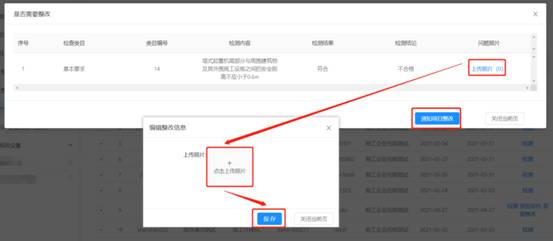 选择【是】,弹出提示框,显示具体不合格项及描述。上传照片点击【保存】,编辑完成后点击【通知项目整改】。