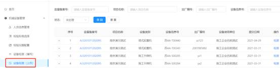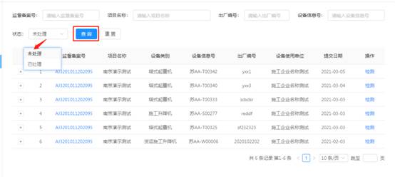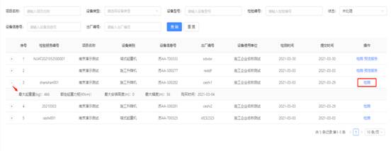 可根据项目名称(输入框)、设备类型(选择框)、设备型号(输入框)、检验编号(输入框)、状态(选择框)、设备信息号(输入框)、出场编号(输入框)其中一项或多项对施工企业项目部申请检验检测的机械设备进行模糊查询。点击【重置】清空当前选择及输入的内容。