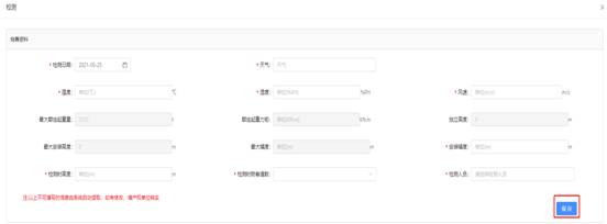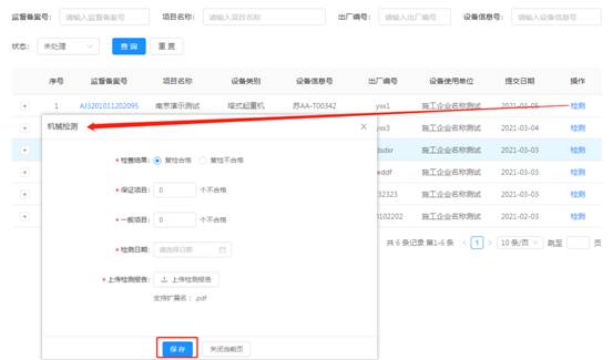 选择需检测的设备,点击操作栏中的【检测】,进入检测页面。按要求填写检测基本信息,“*”为必填项,输入完后点击【保存】。