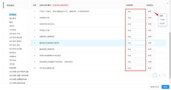 按项目类别逐一填写,检测结果为输入框(输入框为必填),按检测情况如实填写;检测结论为选择框,选择【合格】/【不合格】/【无此项】,点击【保存】。
